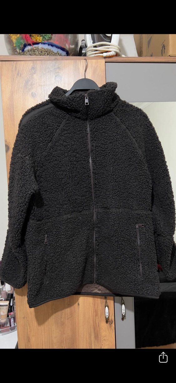 Yumuşak ve sıcak kumaştan, siyah fermuarlı, yüksek yakalı kadın ceketi. Uzun kollu, vücuda oturan midi boyda, rahat sokak stili için uygun.