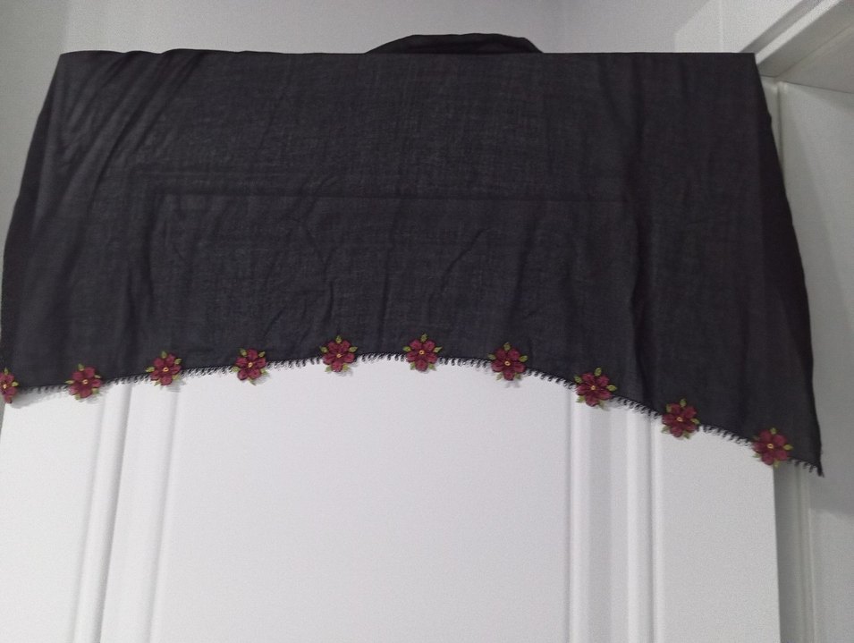 Kadınlar için siyah renkte, kenarlarında fırfır detaylı tekstil kumaştan yapılmış bohem ve retro tarzda şal.