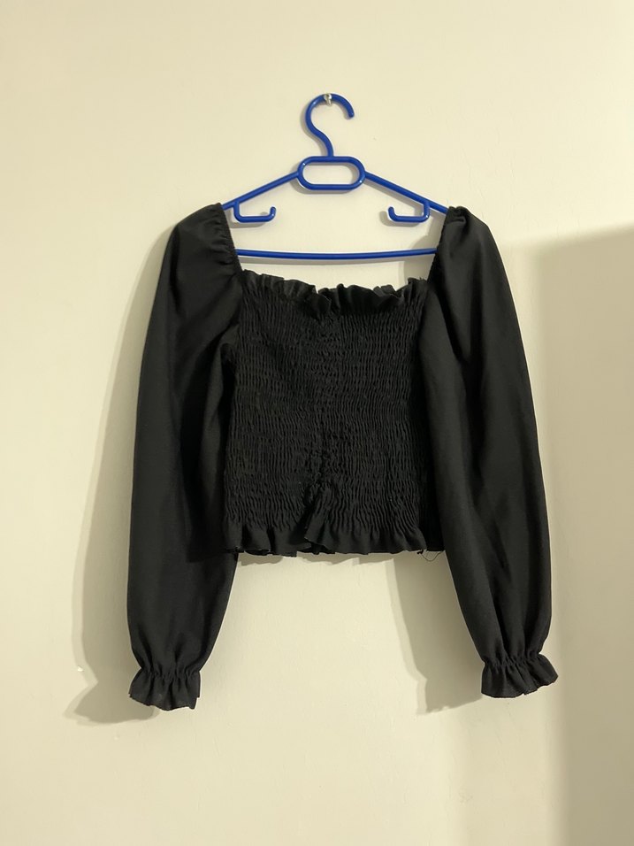 Fitted kesim siyah keten bluz, uzun kollu ve kayık yaka. Fırfır detaylarıyla minimalist gotik tarz sunar, günlük kullanım için uygundur.