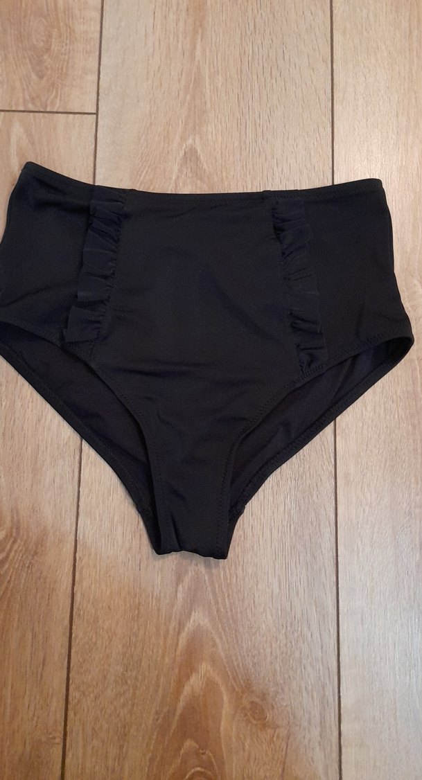Siyah, fırfırlı detaylara sahip, mini uzunlukta ve fit kesim bayan bikini altı. Cesur goth tarzıyla plajda rahat kullanım sağlar.