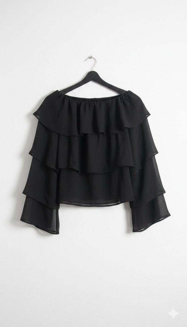 S M L beden uyumludur Kadınlar için siyah, kat kat fırfırlı, kayık yaka ve uzun kollu bluz. Sentetik kumaştan, bol kesim ve minimalist gotik tarzda, ofis kullanımı için uygun.