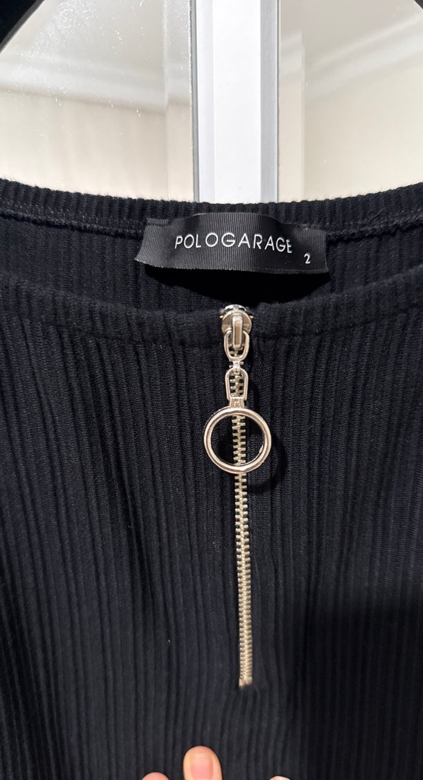 Fermuarlı, uzun kollu, yuvarlak yakalı siyah fitilli midi örme elbise. Minimalist baskılı desene sahip, trend günlük stil için uygun.