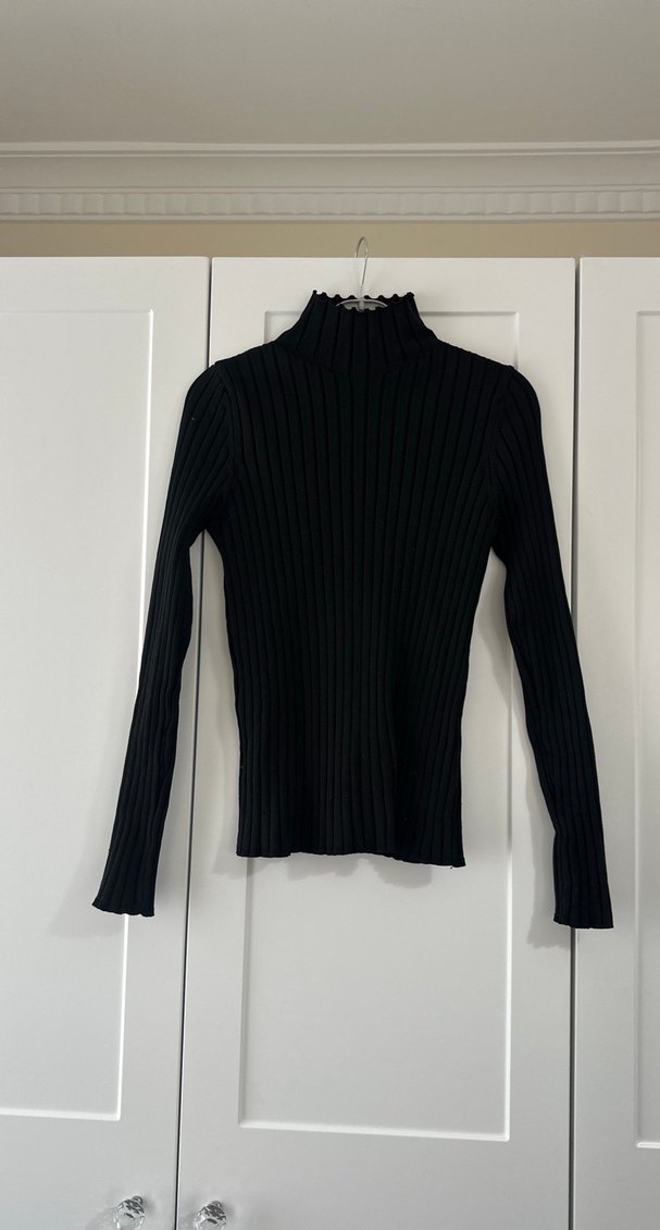 Yarım balıkçı yaka ve uzun kollu, fit kesim siyah kazak, fitilli örme yapısıyla şık ve trend bir görünüm sunar. Günlük kullanım için uygundur.