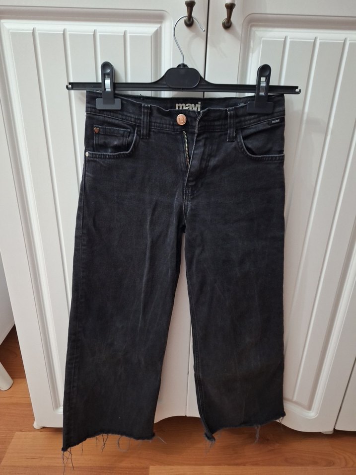 Siyah, geniş kesim, midi boy kot pantolon. Ham kenarlı ve tokalı detaylı, gündelik normcore tarz için uygun.