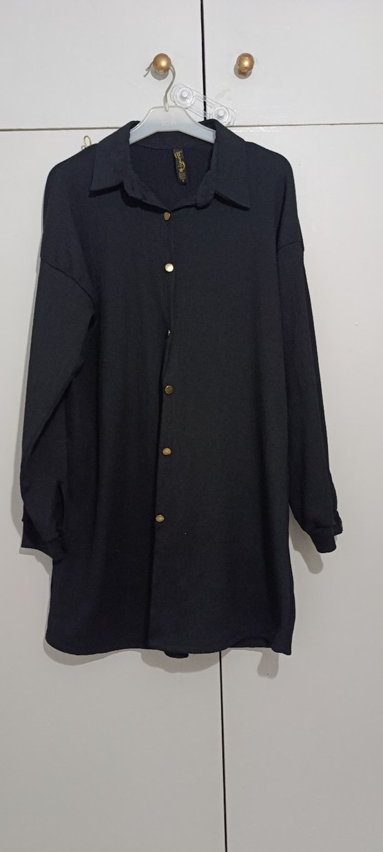 Düğmeli, siyah uzun gömlek, bol kesim ve kırlangıç yaka ile. Keten kumaştan, günlük rahat sokak stiline uygun, minimalist tasarım. Düğmeli, siyah uzun