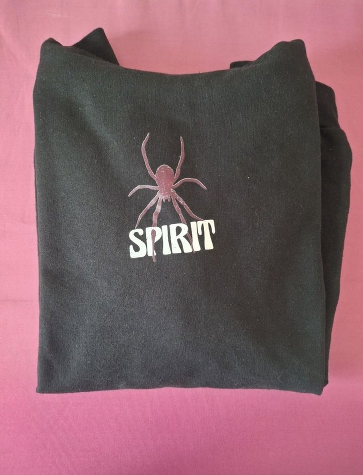 Uzun kollu, kapüşonlu, fermuarlı siyah fitted sweatshirt. Önünde örümcek ve "SPIRIT" baskısı var. Rock punk tarzına uygun. ️