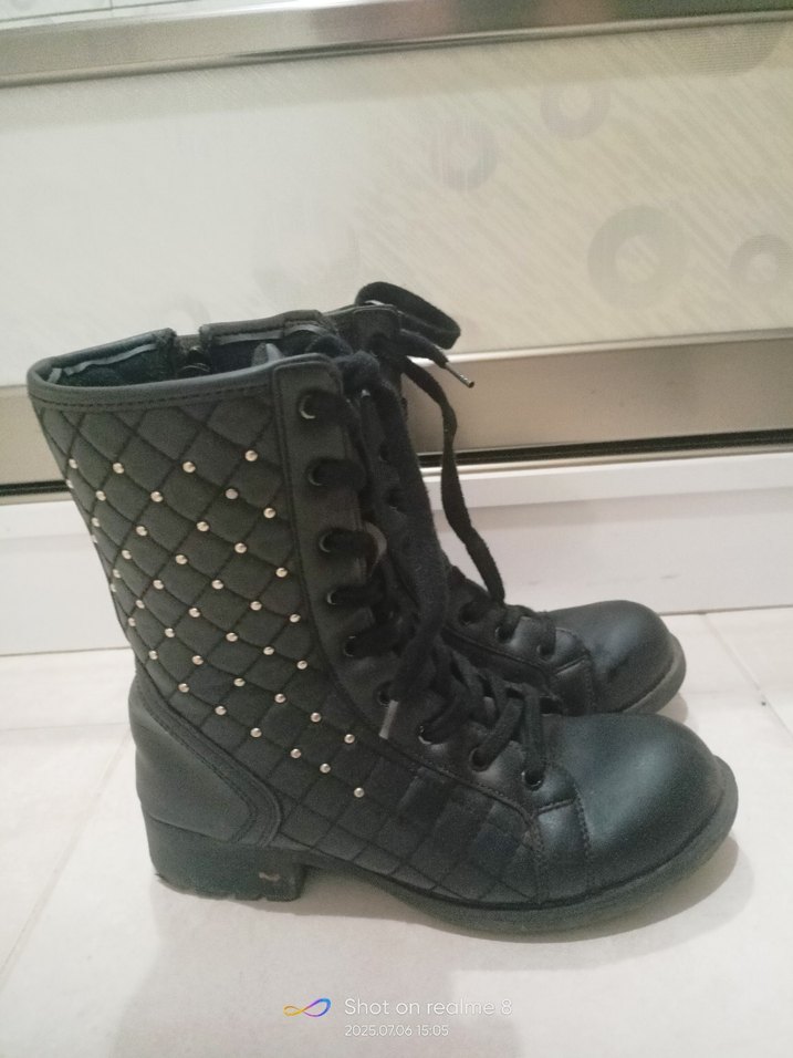 Bağcıklı, siyah gotik bot, alçak topuklu, temiz, defosuz bot