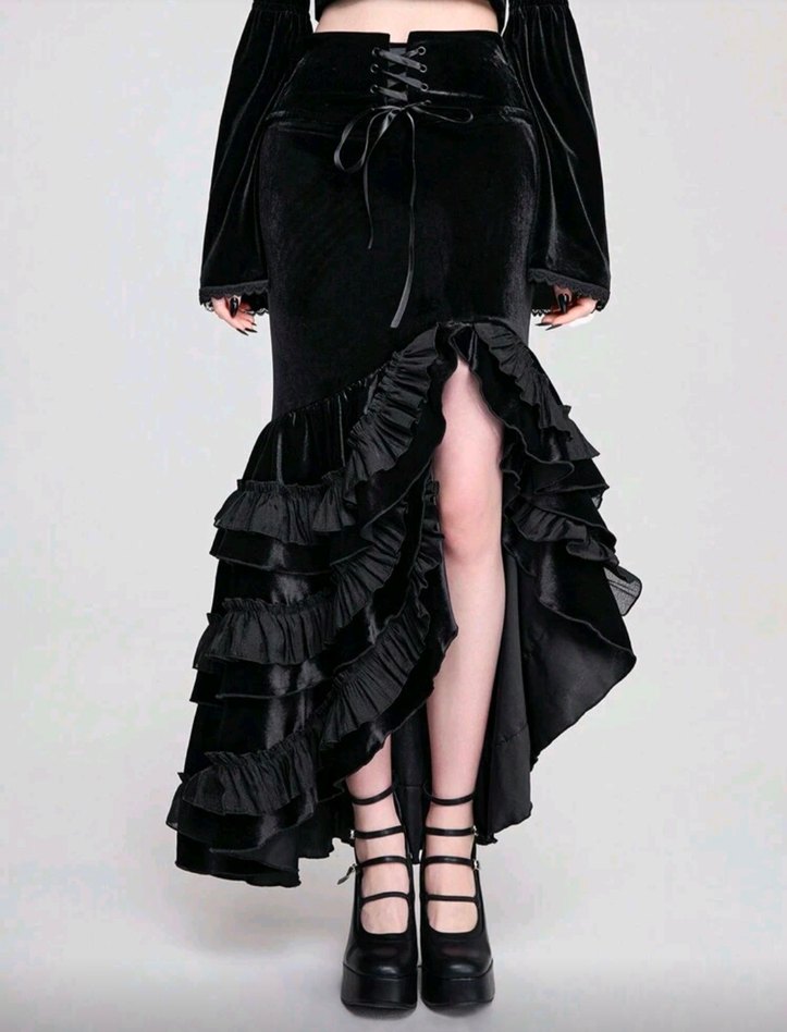 Kadın Siyah Gotik Fırfırlı Uzun Etek