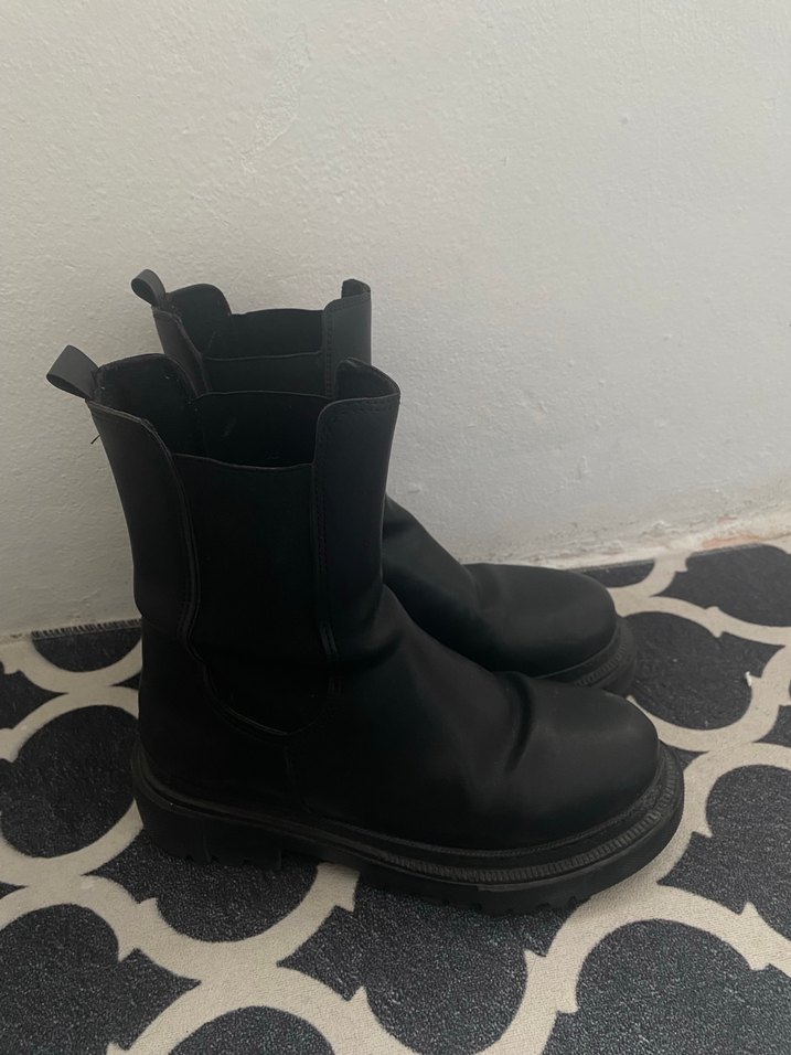 Siyah lastik botlar, platform topuklu ve tokalı detaylı. Gotik tarzda, günlük kullanıma uygun, koyu ve desensiz görünüme sahip.