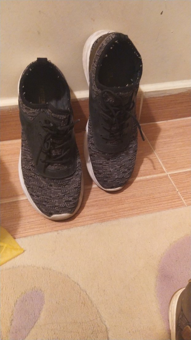 Bağcıklı, siyah ve gri kadın spor ayakkabısı. İnce topuklu ve kauçuk tabanlı, spor ve sokak giyimine uygun.