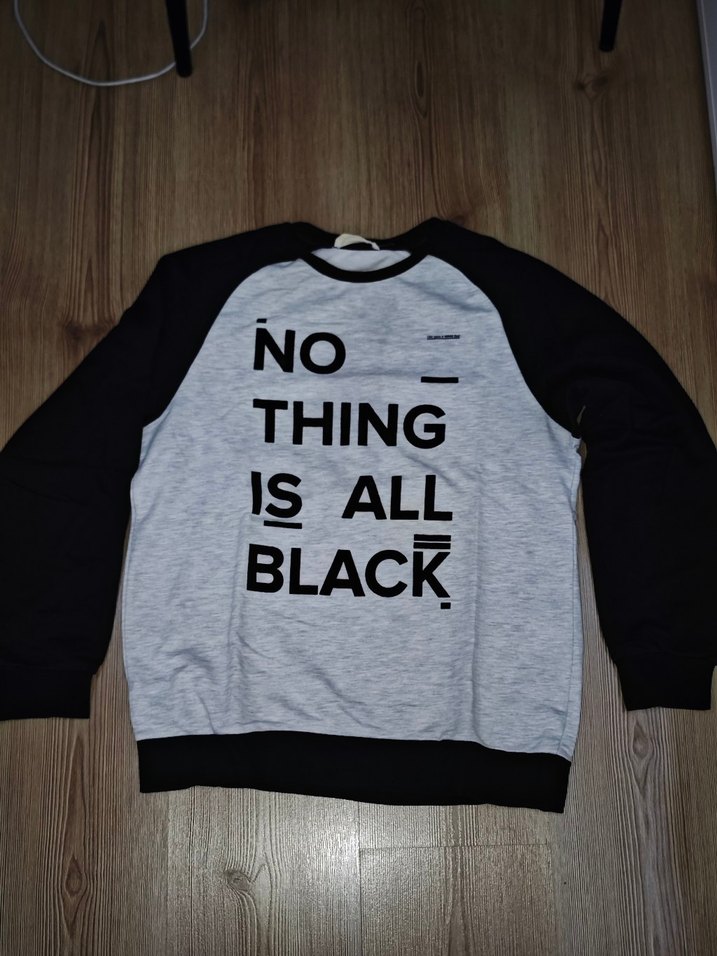 Kadın sweatshirt, uzun kollu ve bisiklet yaka. Siyah ve gri renklerde, önünde baskılı yazı bulunur. Pamuklu kumaştan üretilmiştir. Etiketi yok fakat hiç kullanılmadı.