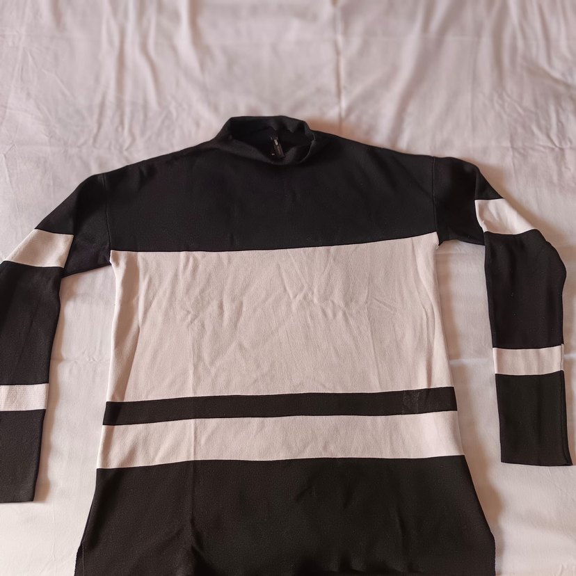 Kadınlar için boğazlı ve uzun kollu, siyah ve gri renklerde, düz desenli, rahat sentetik kumaştan yapılmış şık ve athleisure tarzı sweatshirt. İki ğç kez giyildi