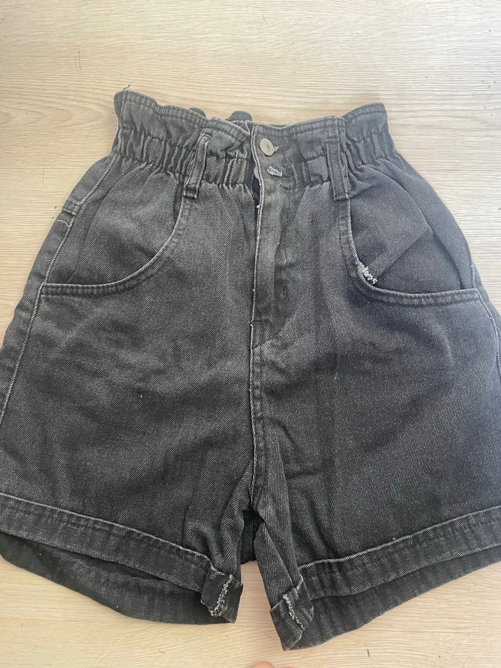 Siyah gri renkli, kemerli ve bol kesim kısa kot şort, günlük rahat stil için uygundur.