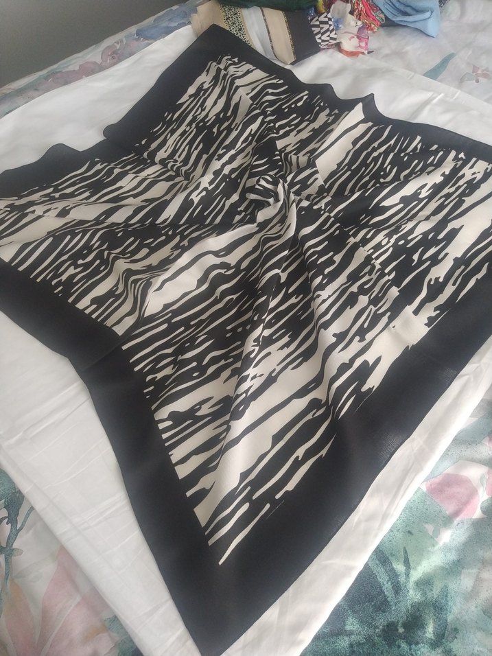 Kadın siyah ve gri renklerde, sentetik kumaştan drapeli, minimalist tarzda modern bir eşarp