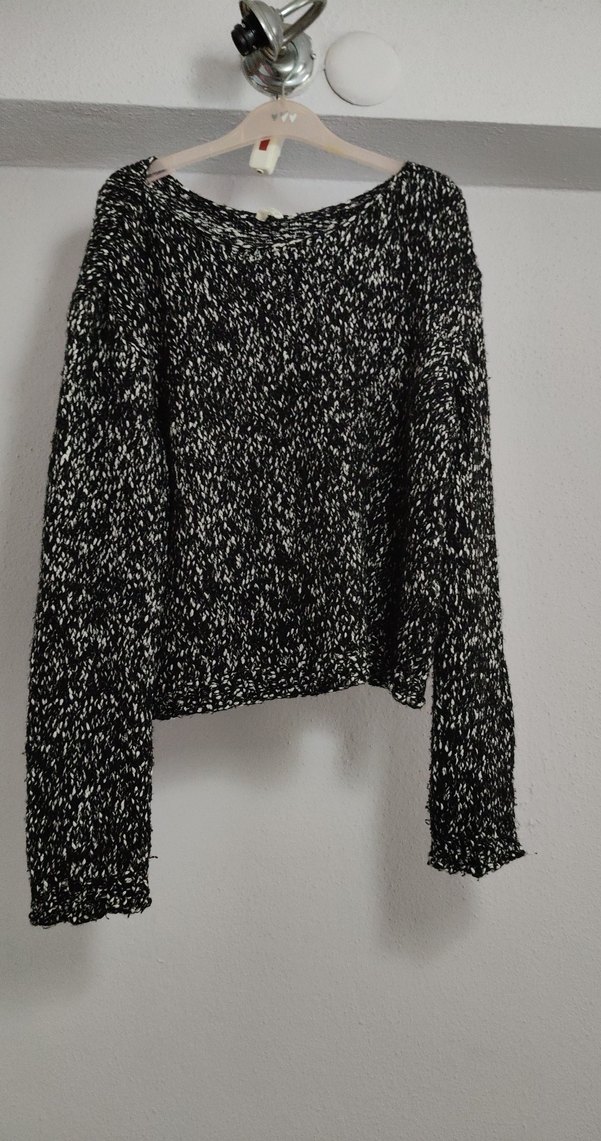 Kadın siyah gri renkli, örgü kumaştan yapılmış, uzun kollu, yuvarlak yaka, rahat kesim normcore tarzda kazak.