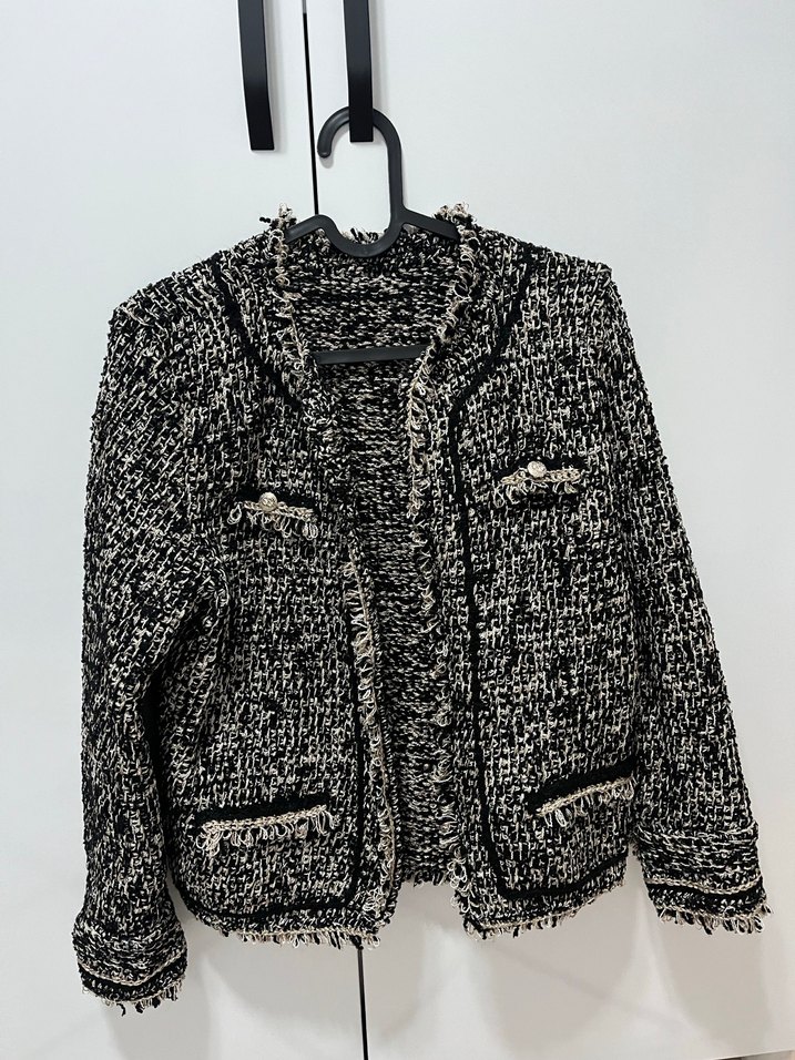Kadınlar için siyah ve gri renklerde, örgü dokulu kısa uzunlukta, notlu yaka ve uzun kollu, günlük kullanıma uygun trend sokak stili ceket.