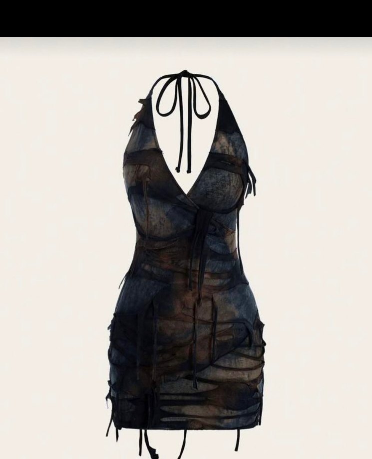 Siyah, dar kesim elbise, halter yaka ve askılıdır. Sentetik kumaştan, koyu batik desenlidir ve drapeli detaylara sahiptir. Parti için uygundur.