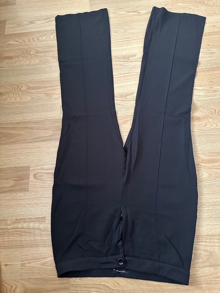Kadınlar için siyah midi boy kumaş pantolon, düzenli kesim ve yırtmaç detayına sahip, sentetik kumaştan üretilmiştir. Ofis ve iş ortamı için uygundur.