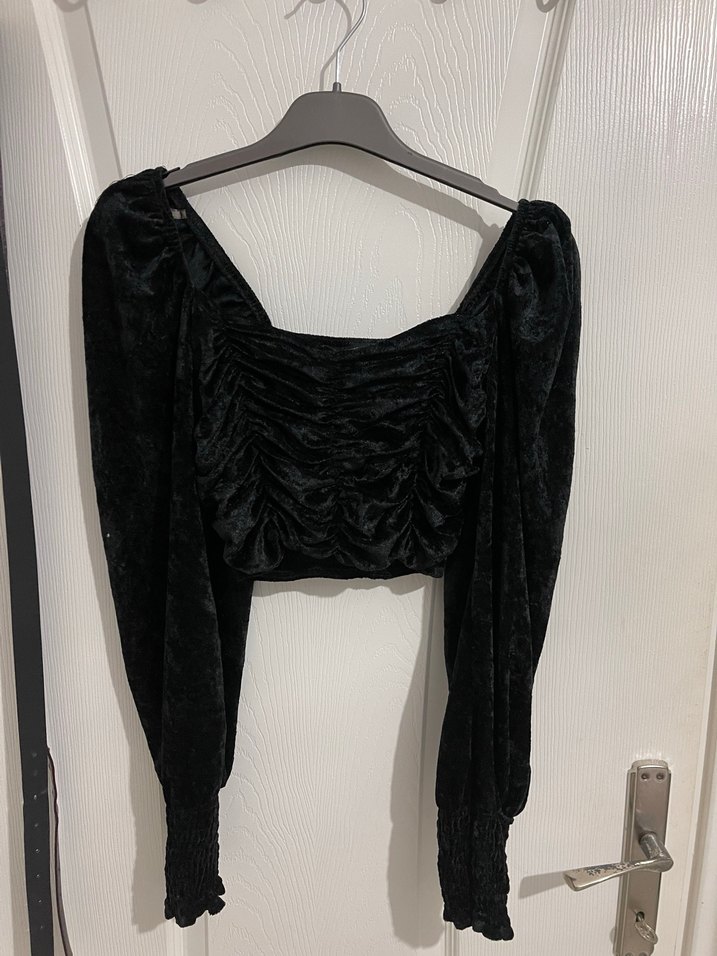 Kare yaka fakat kol kısımları lastikli düşük kol da kullanabilirsiniz. Ürün crop modeldir ön kısmı büzgülü, bilek kısmı lastiklidir bi kusuru yok hiç giyilmedi