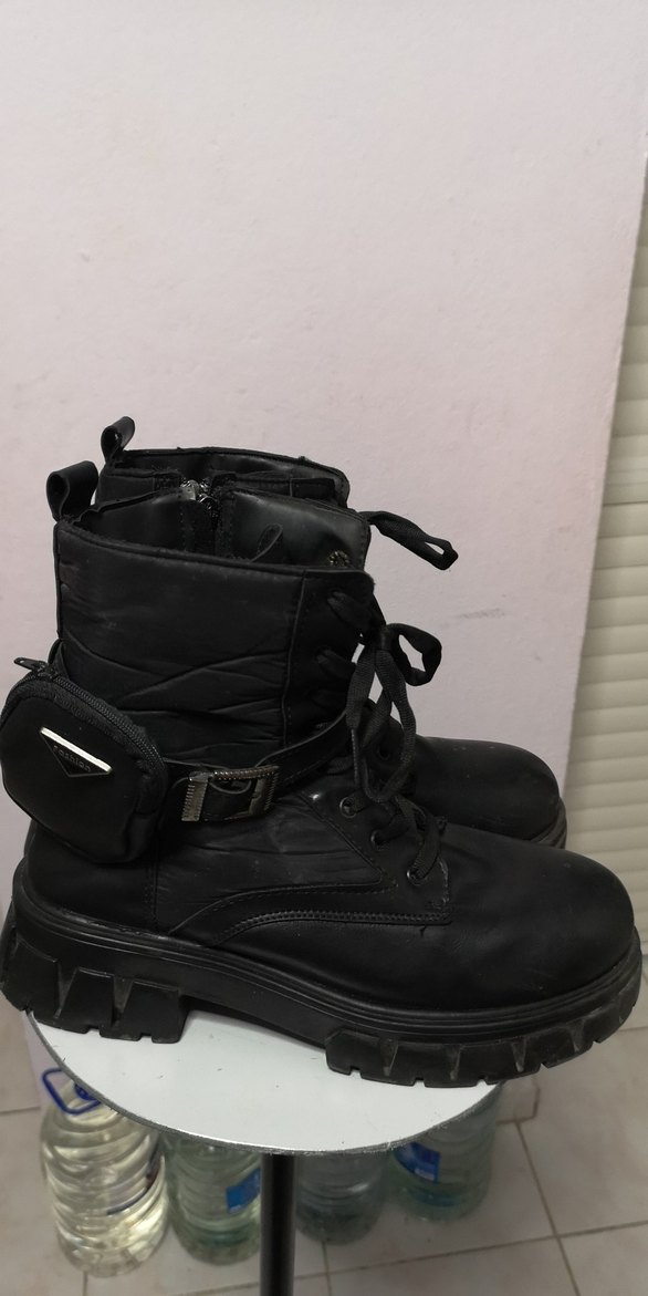 Siyah kauçuk platform topuklu botlar kamuflaj desenli, kemerli ve küçük yan çanta detaylıdır. Trend sokak stili için uygundur. 40 numara az giyildi