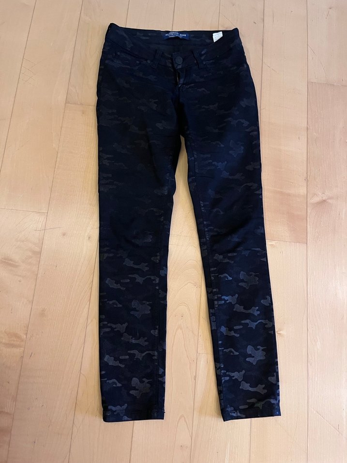 siyah kamuflaj desenli, kot kumaştan yapılmış, belinde tokalı, normal boyda, dar kesim kadın pantolonu. Günlük rahat kullanım için uygundur.