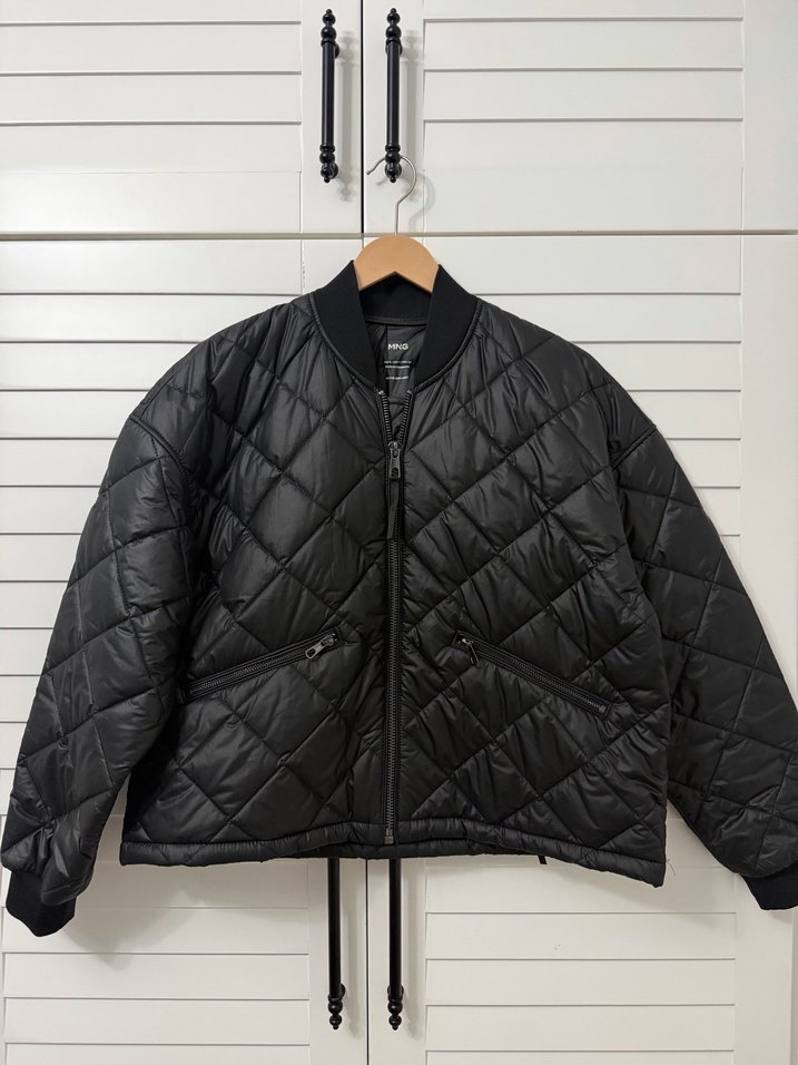 Siyah kapitone, bol kesim midi ceket, askılı kollu ve bisiklet yaka. Sentetik kumaştan, kemer detaylı, günlük kullanıma uygun.