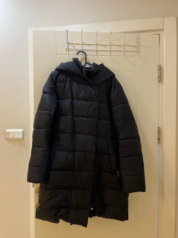 Siyah kışlık mont, yüksek yakalı ve tokalı detaylara sahip, vücuda oturan kesimdedir. Yumuşak ve sıcak tutan fleece kumaştan üretilmiş, sade desende ve midi boyda, rahat ve şık bir sokak stili sunar.