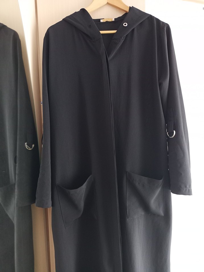 Kadınlar için siyah uzun, düğmeli ve salaş kesim İpeksi dokusu, uzun kolları ve geniş ön cepleriyle günlük sokak stili için uygun.