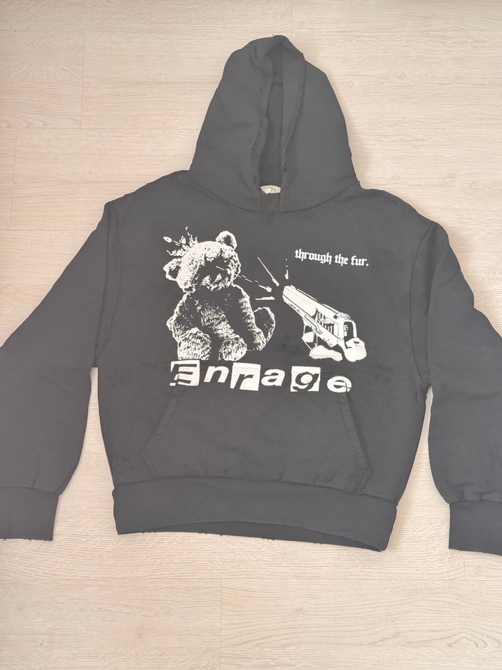 Bol kesim, siyah kapüşonlu sweatshirt, ayı ve tabanca baskısıyla 'gnrage' yazılıdır. Uzun kollu ve tokalı, yumuşak ve sıcak kumaştan yapılmıştır. Eskitme görünümlü hiç kullanılmamıştır