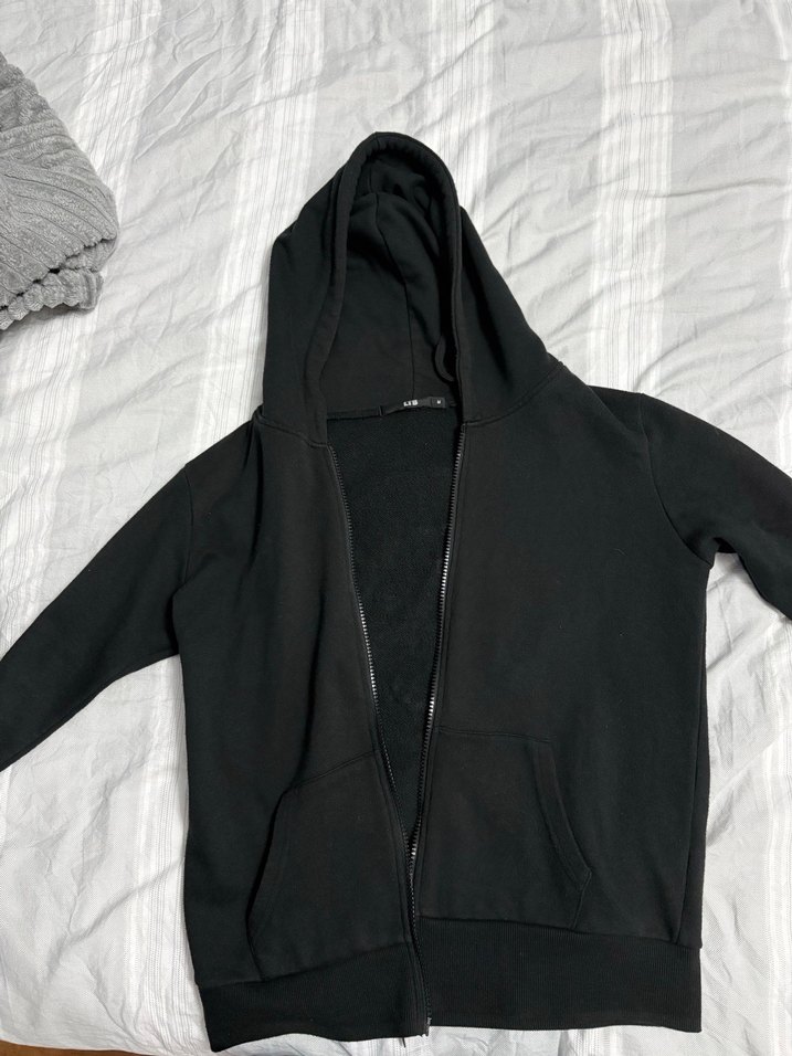 Siyah fermuarlı kapüşonlu sweatshirt, uzun kollu ve arkası taşla desenlenmiş kurukafa modelinde , yumuşak ve sıcak kumaştan. Günlük kullanıma uygun minimal stil. Renginde hafif bi solma var başka hiç bir hasarı yoktur