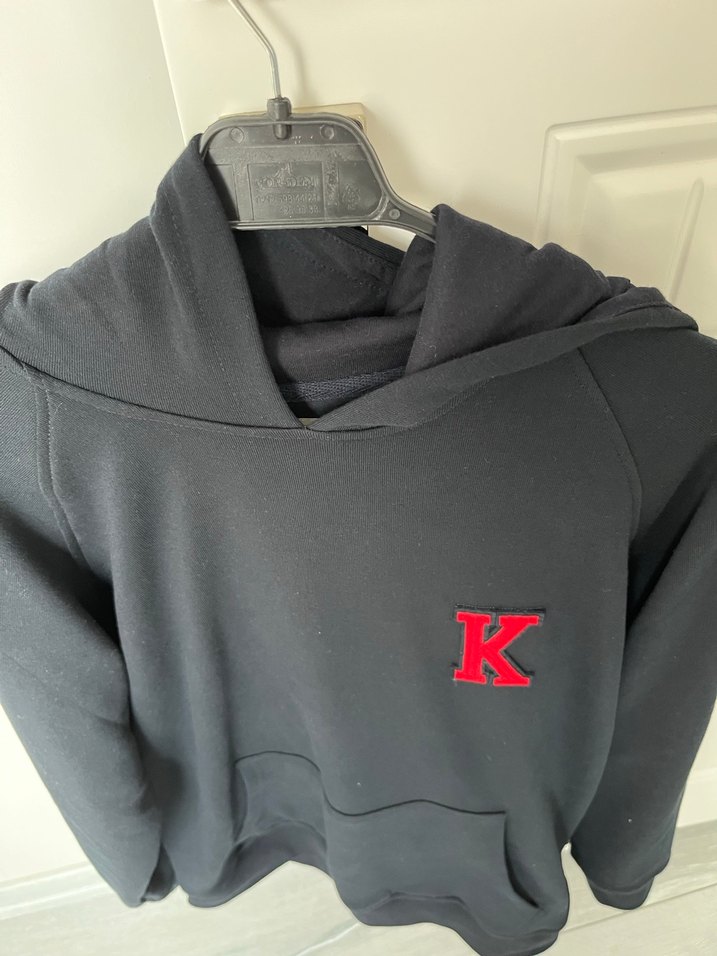 Uzun kollu, fermuarlı ve kapüşonlu siyah fitted sweatshirt. Kırmızı 'K' baskılı, yumuşak ve sıcak dokulu kumaştan, normal boyda.ted koleji kıyafetidir seeet ve tişört beraberdir bir kez giyildi
