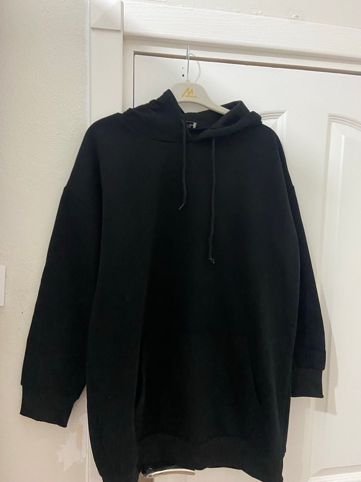 Kadın siyah kapüşonlu ve fermuarlı sweatshirt, bol kesim ve uzun kolludur. Yumuşak ve sıcak kumaştan, günlük rahat kullanıma uygundur. 1 2 kere kullanılmış temizdir. Bedeni s/m dir