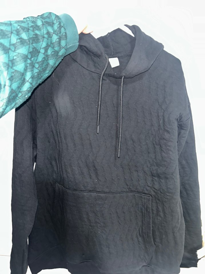 Siyah kapüşonlu, uzun kollu ve bol kesim sweatshirt. Fermuarlı ve yumuşak, sıcak tutan kumaştan, günlük rahat sokak stili için uygundur.