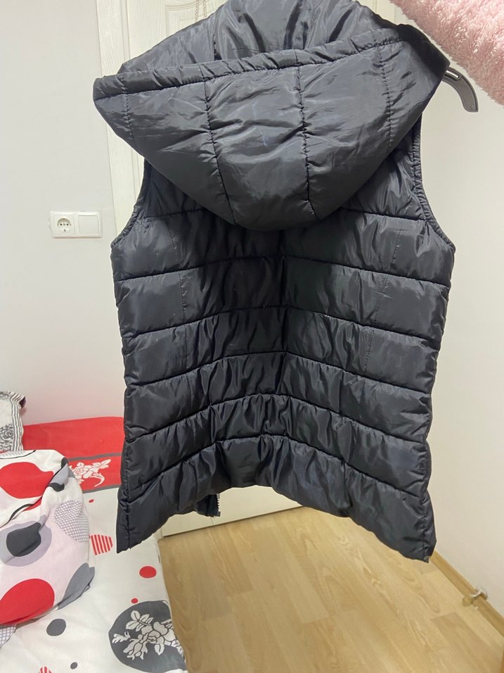 Kadın siyah kapüşonlu yelek, yüksek yakalı ve fermuarlı. Sentetik kumaştan, normal boy ve dar kesimle rahat bir sokak stili sunar.