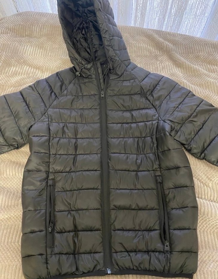 Siyah, kapüşonlu, fermuarlı ve yüksek yakalı kadın kış montu. Uzun kollu, normal boyda, rahat ve şık günlük kullanım için uygun.