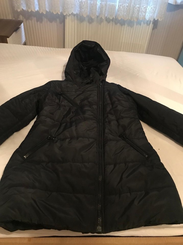 Siyah, kapüşonlu ve fermuarlı ceplere sahip, diz boyu uzunlukta, yumuşak ve sıcak kumaştan yapılmış kadın kışlık mont.