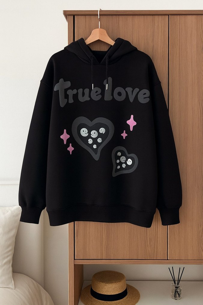 Yumuşak kumaştan, uzun kollu, kapüşonlu ve bol kesim siyah sweatshirt. Nakışlı kalpler ve 'truelove' yazısı detayları bulunur.