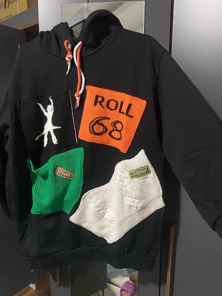 Siyah renkli, uzun kollu ve kapüşonlu örgü sweatshirt. Renkli örgü detaylar ve baskılar içerir. Salaş kesim ve, sokak tarzı için uygun. Tasarım olarak aldım