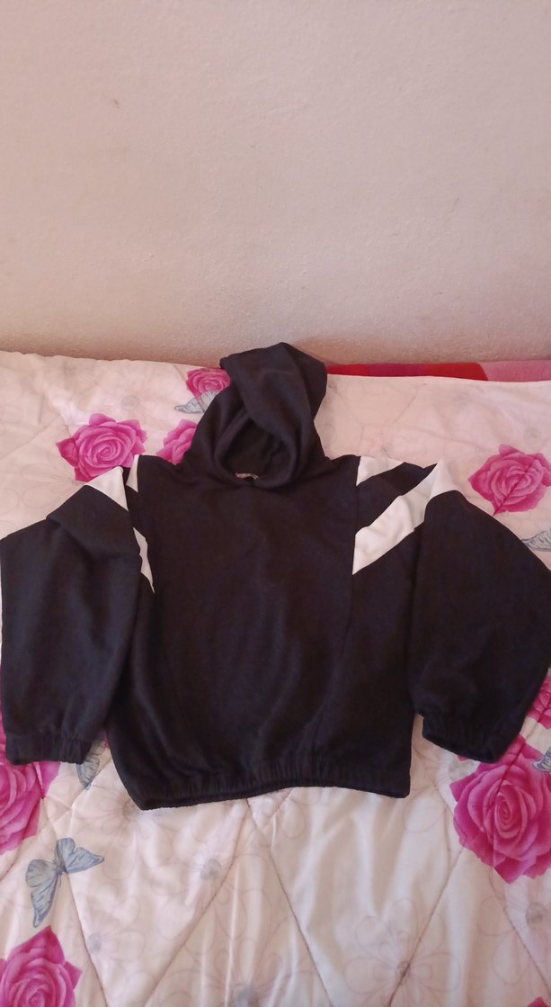 Kadın siyah kapüşonlu sweatshirt, uzun kollu ve bol kesimdir. Normal boyda, renk bloklu ve fırfır detaylıdır.