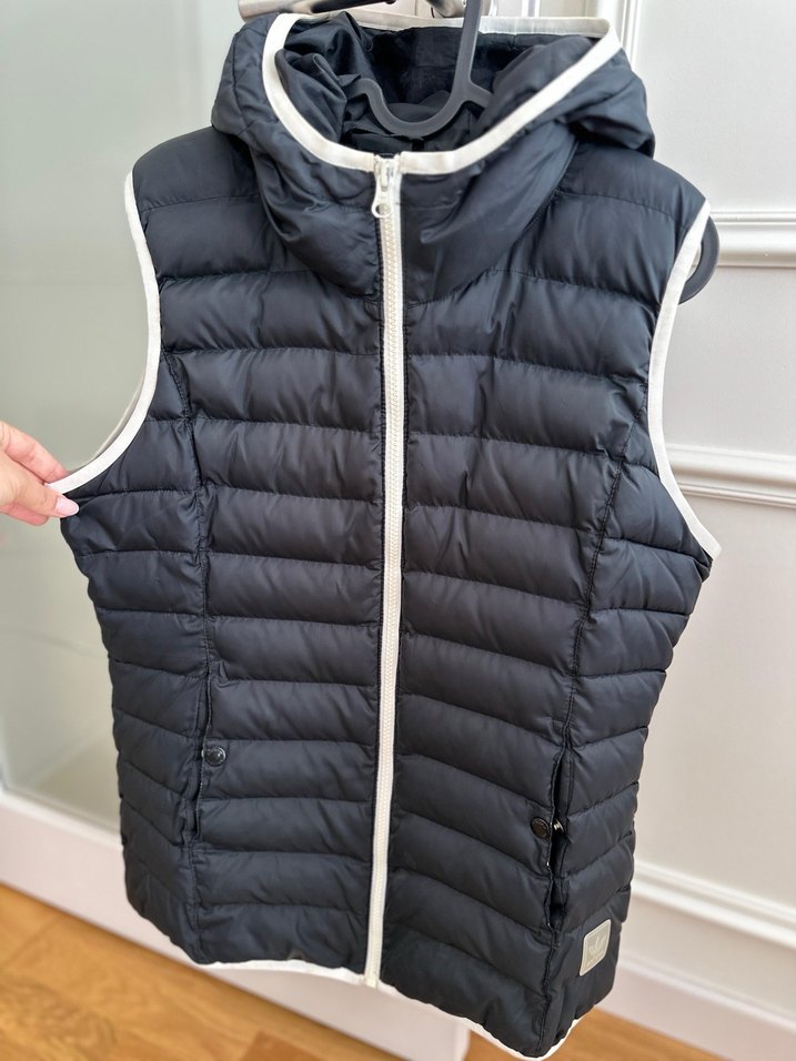 Siyah kapüşonlu, fermuarlı, yüksek yakalı, kısa kollu şişme yelek. Sentetik kumaştan, normal boyda ve dar kesimdir.