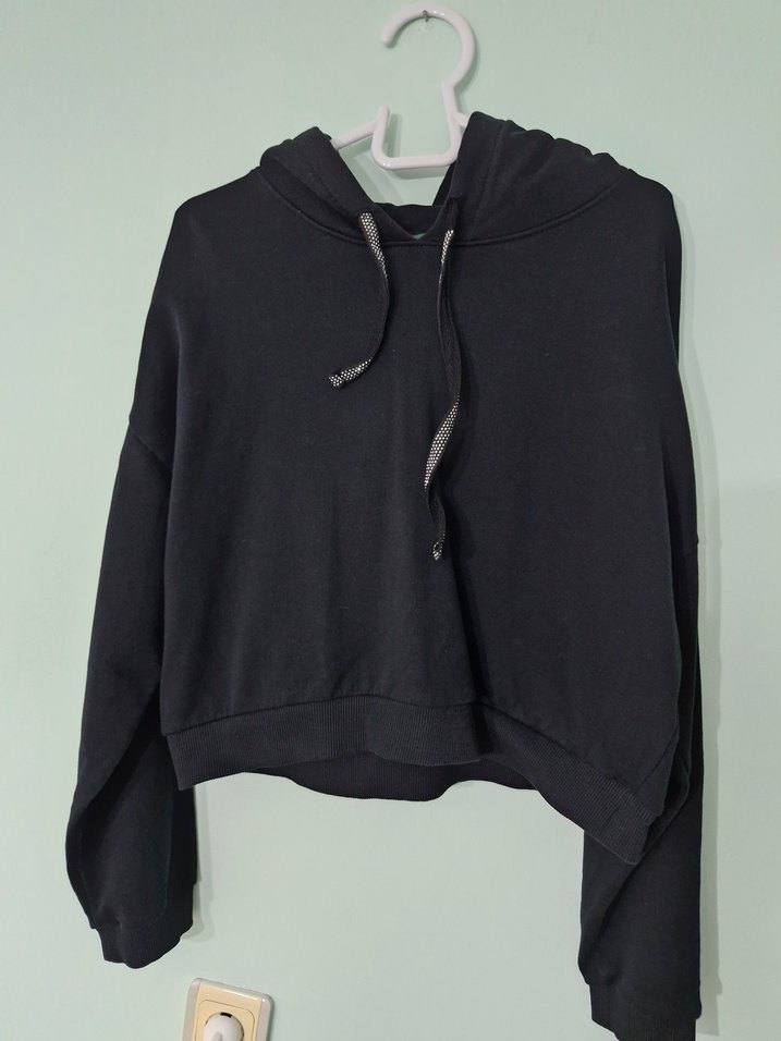 Kadın siyah kapüşonlu sweatshirt, yuvarlak yaka ve uzun kolludur. Rahat kesimi ve yumuşak, sıcak kumaşıyla günlük sokak stili için uygundur.