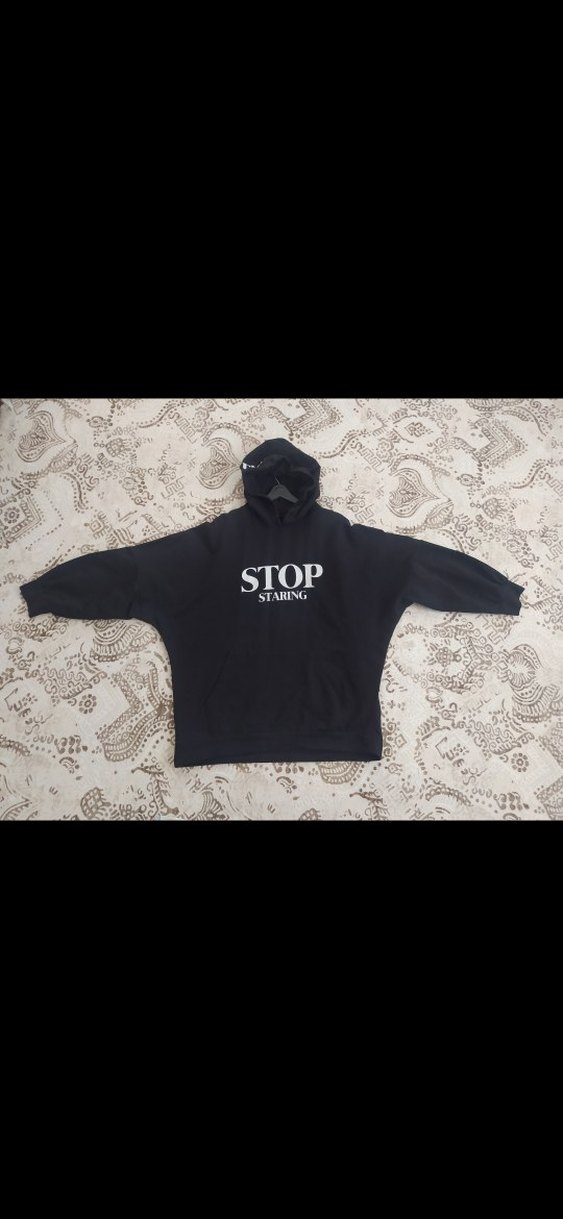 Kadınlar için siyah kapüşonlu, uzun kollu ve bol kesim sweatshirt. Önünde "STOP STARIN" baskısı ve cırt cırt detayları vardır. Yumuşak ve sıcak kumaştan üretilmiştir.