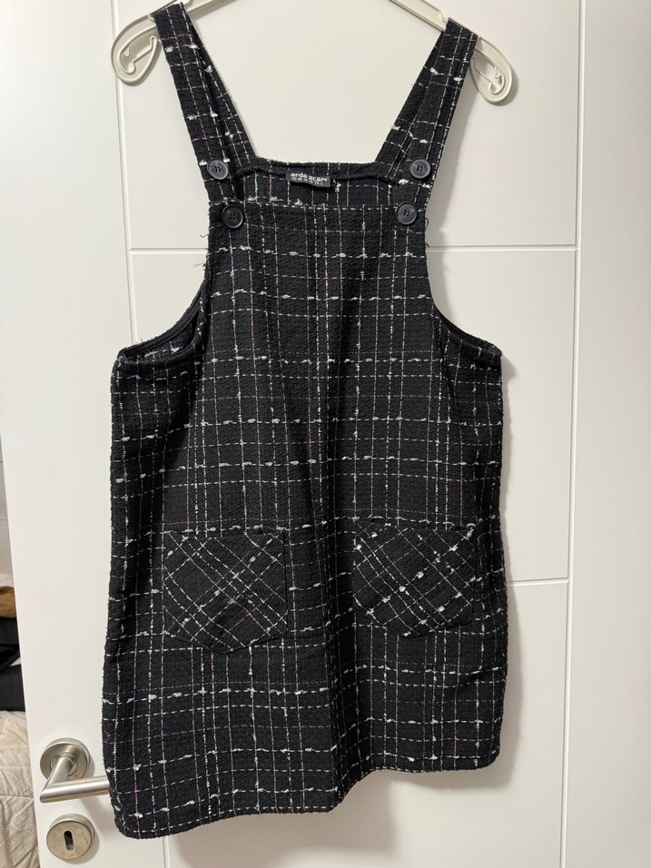 Siyah kareli, askılı, tokalı ve yüksek yakalı midi salopet. Rahat kesimi ve ön cepleriyle trend bir günlük stil sunar.
