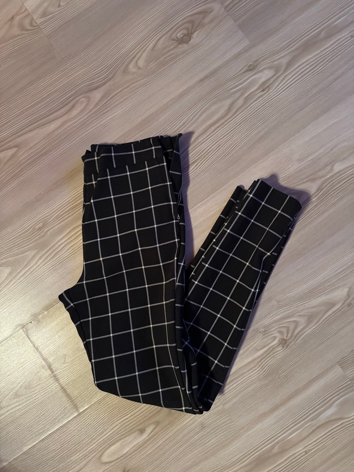 Kadınlar için kareli desenli, regular fit ve tokalı detaylı siyah kumaş pantolon. Sentetik kumaştan, midi boyda, günlük kullanıma uygun şık bir parça.