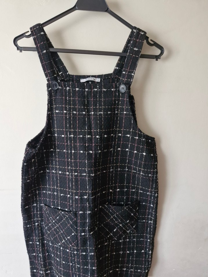Kadınlar için siyah kareli, askılı ve tokalı kısa tulum. Normal kesim, midi boy ve günlük sokak stili için uygun. Önünde iki cep bulunur.