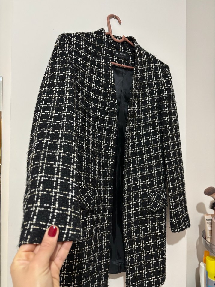 Kadınlar için siyah kareli, normal boy midi blazer. Öğretmen olduğum için siyah pantolon kombinlerimde oldukça kullandım. Ürünün dış kısmında hiç bir deformasyon yok. Her yıl kuru temizleme yapılarak kullanıldı. Bedeni xs.