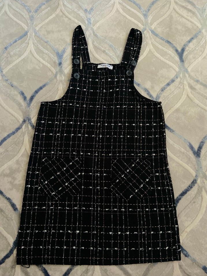 Kadınlar için siyah kareli örme kumaştan, askılı ve midi boyda kısa tulum. Regular fit kesim, günlük sokak stiline uygun, iki ön cepli, rahat bir parça.