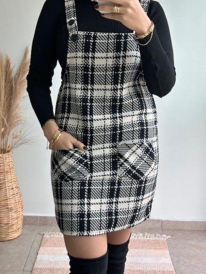 Siyah ve gri kareli triko midi elbise, boğazlı yaka ve askılı kollara sahip, günlük rahat kullanım için uygun regular fit sağlar.