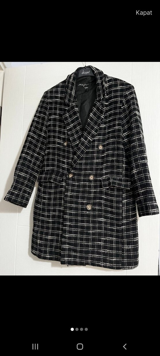 Siyah kareli, uzun kesim, düğmeli ve kruvaze yaka detaylı kadın kabanı. Rahat kesimi ve uzun kollarıyla günlük kullanıma uygundur.