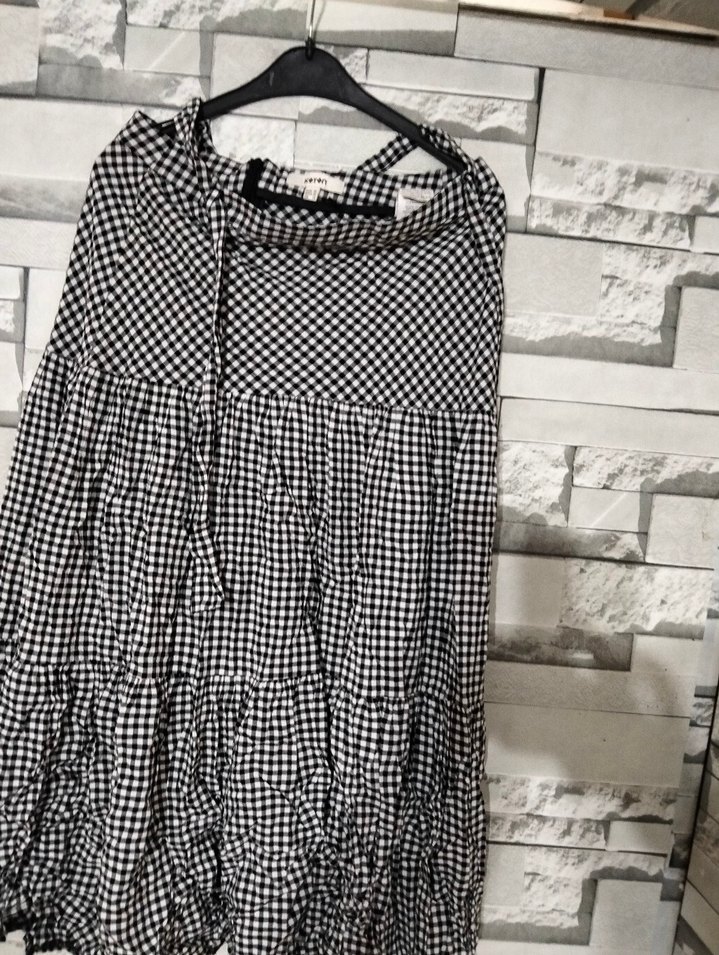 Kadınlar için keten kumaştan, siyah kareli ve pilili, bol kesim uzun etek. Bohem ve Parisian tarzını yansıtır, günlük kullanıma uygundur.